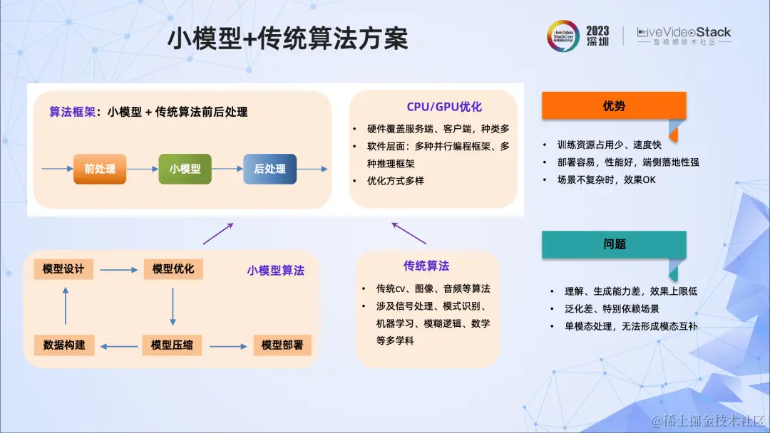 多数情况下,我们采用小模型、传统算法或者两者结合的方法。其优点是:小模型、传统算法在算法开发、工程优化方面已相对比较成熟,小模型的训练资源占用少且训练速度快,部署容易,端侧落地性强。但是问题也比较突出,比如模型的泛化能力差,效果上限比较低,理解、生成能力比较差等。