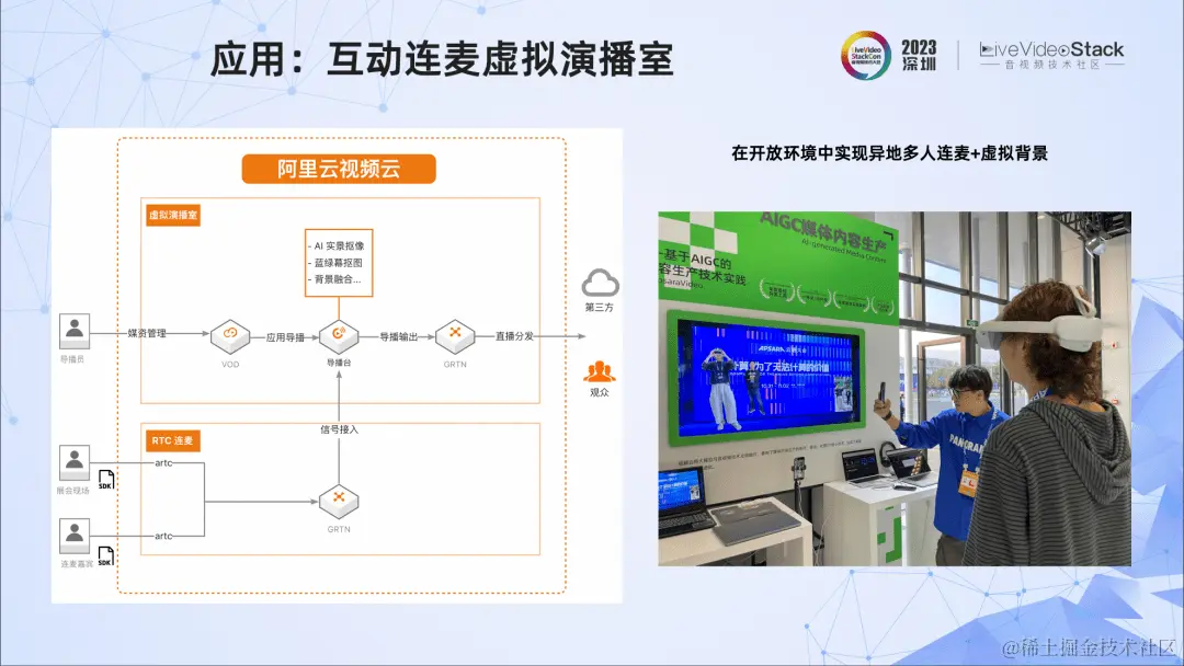 在刚刚过去的云栖大会,我们也展示了一个抠图的应用,在开放环境中,实现异地多人实时连麦+虚拟背景的功能。右图是现场演示的图像。