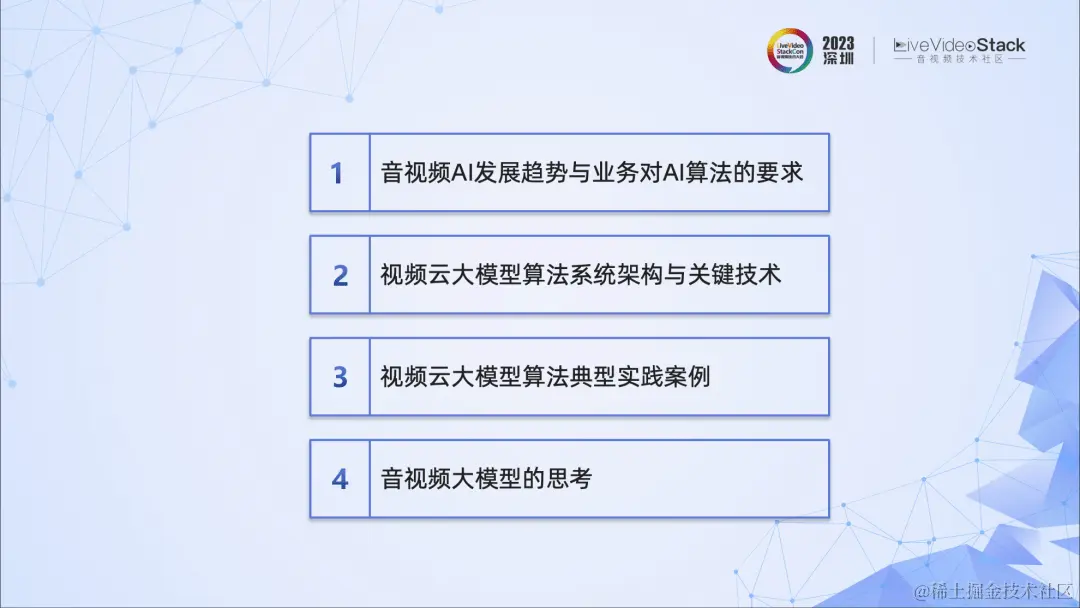 针对音视频业务对AI算法的更高要求,我们采用了大模型的技术,设计了一套基于视频云大模型算法开发的系统架构,并实践、提炼了一些关键技术,形成了一套较为通用的大模型算法落地业务场景的“方法论”。