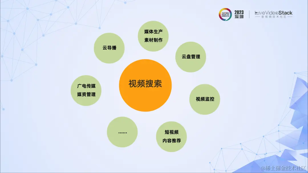 我们再看下媒资管理中的视频搜索。它的应用也非常广,包括广电传媒、云导播、云盘管理、短视频内容推荐、视频监控等。