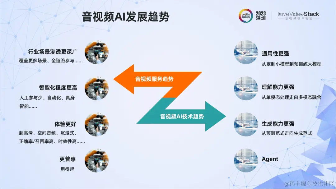 随着AIGC的发展,音视频领域的AI技术也呈现出了新的趋势,即对AI技术的通用性、理解能力、生成能力都提出了更高的要求。过去纯粹的定制小模型开发、单模态处理和预测范式有不少缺陷,触达到了能力上限,而目前音视频AI技术则走向了泛化能力非常强的预训练大模型、多模态信息融合、生成式等方向。还有值得提出的一点是AI Agent的能力,即要求AI有感知、决策、行动的能力,它目前已成为一个重要的研究方向。