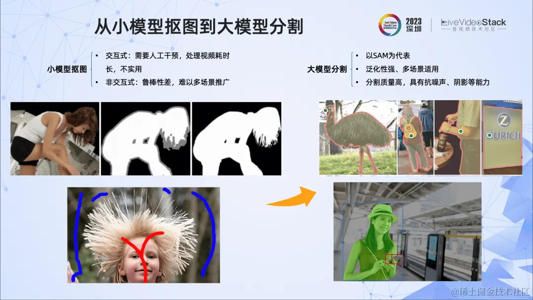 我们先看下小模型方法能否实现高质量抠图。经过深入调研,我们发现很多抠图效果好的方法都采用人工干预的方法,这种方式对单帧图像比较友好,但对于视频,往往处理耗时久,不太实用。而采用非交互式方式的抠图,鲁棒性则较差,往往只能较好地抠人像,难以在多场景推广。