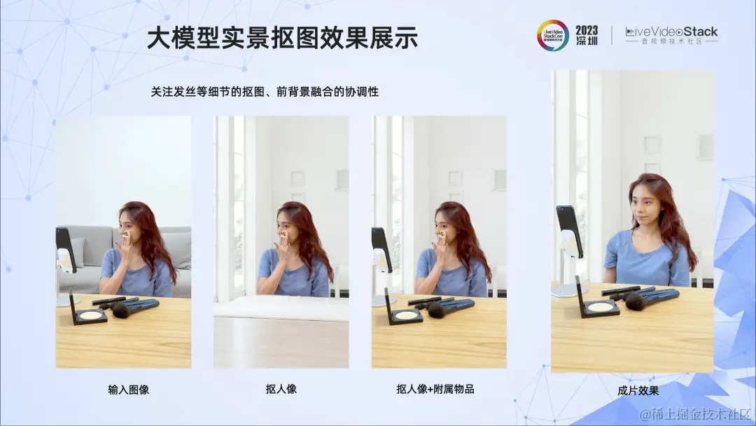 我们看下抠图的效果。对于输入图像,我们实现了抠人像、以及抠人像加桌子/化妆品/手机等附属物的效果。这个抠图质量还是比较高的,特别是发丝抠图效果非常细腻,人物、物体的抠图边缘都很精细。