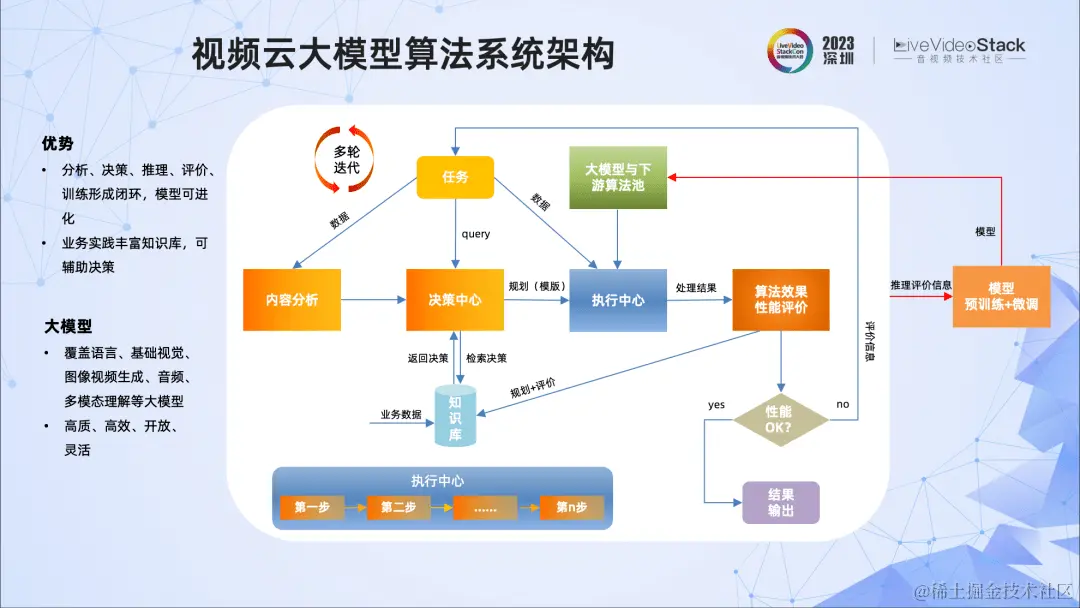 首先,我们根据视频云的业务特点,设计和搭建了一套基于视频云大模型算法开发的系统架构。整个系统涵盖了分析、规划、推理、评价、训练与微调的全链路,并且是可进化、可决策的。