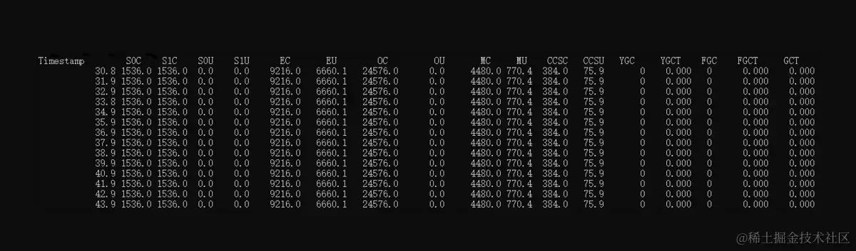 [option]:监控参数选项。-t:在输出结果中加上Timestamp列,显示系统运行的时间。-h:可以在周期性数据输出的时候,指定间隔多少行数据后输出一次表头。vmid:Virtual Machine ID虚拟 ID,也就是指定一个要监控的 Java 进程 ID。interval:每次执行的间隔时间,默认单位为ms。count:用于指定输出多少条数据,默认情况下会一直输出。