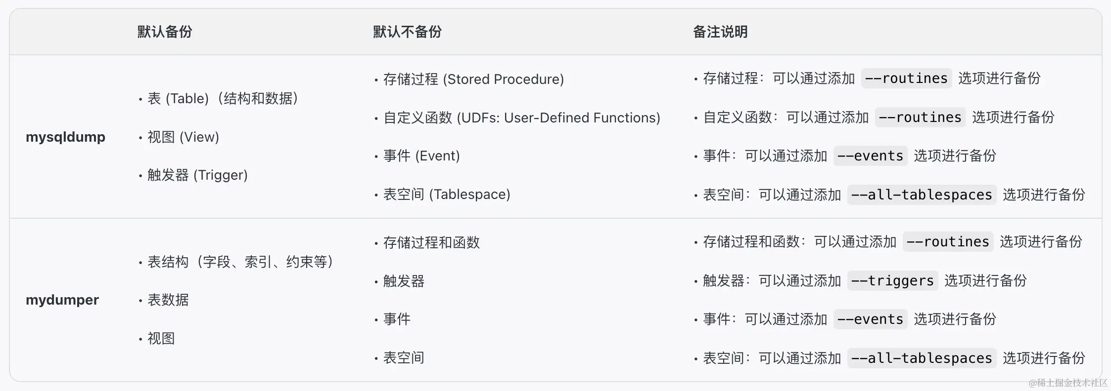 | 备份时机 | 无论 MySQL 是否在运行,均可执行备份操作 | 仅在 MySQL 运行时进行备份,并且应确保备份过程中前端暂停写操作 |