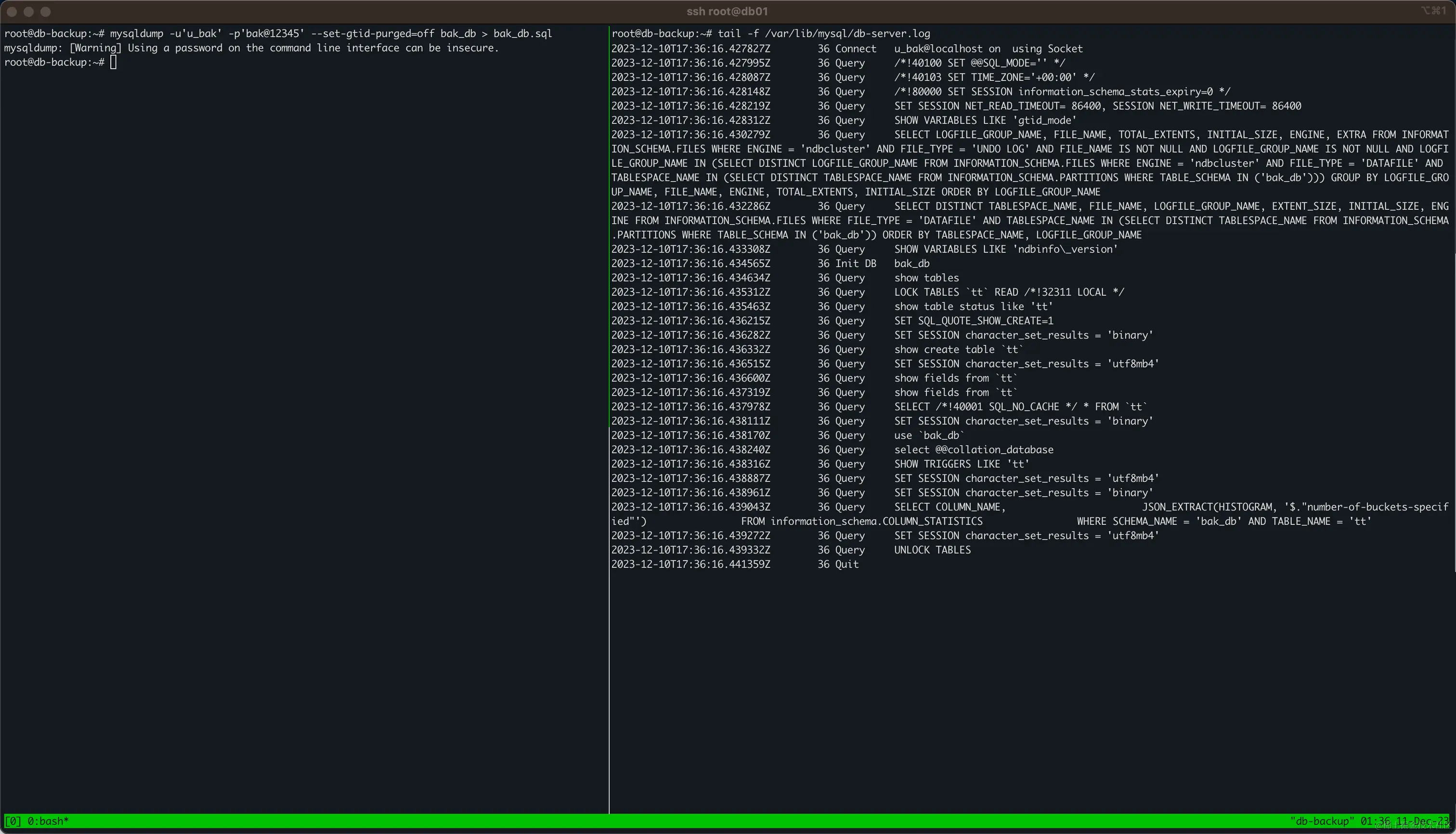 root@db-backup:~# mysqldump -u'u_bak' -p'bak@12345' bak_db > bak_db.sql