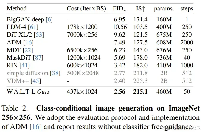 图像生成:表 2 比较了 W.A.L.T 与其它当前最佳方法生成 256×256 分辨率图像的结果。新提出的模型的表现优于之前的方法,并且不需要专门的调度、卷积归纳偏差、改进的扩散损失和无分类器指导。虽然 VDM++ 的 FID 分数略高一些,但它的模型参数却多很多(2B)。