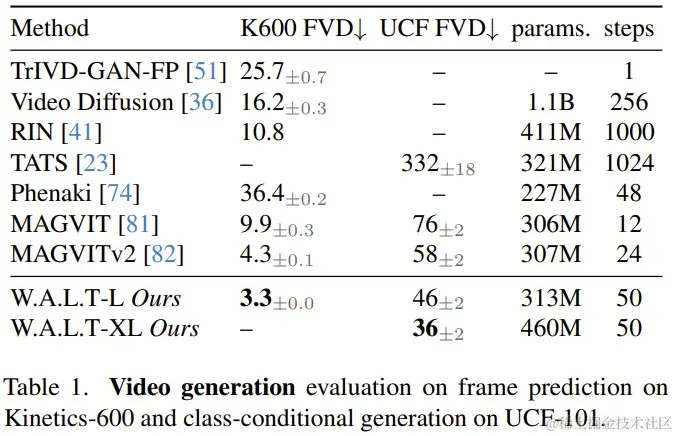 视频生成:在 UCF-101 和 Kinetics-600 两个数据集上,W.A.L.T 在 FVD 指标上优于之前的所有方法,参见表 1。