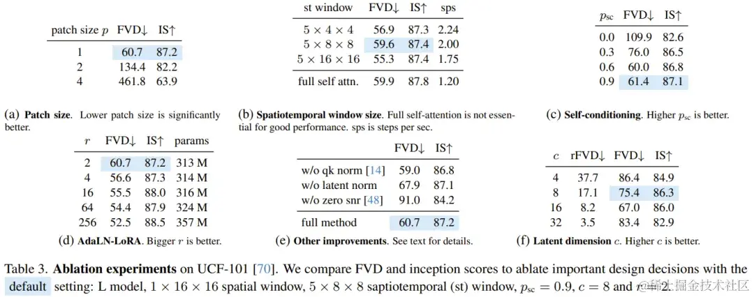 为了理解不同设计决策的贡献,该团队也进行了消融研究。表 3 给出了在图块大小、窗口注意力、自我条件、AdaLN-LoRA 和自动编码器方面的消融研究结果。