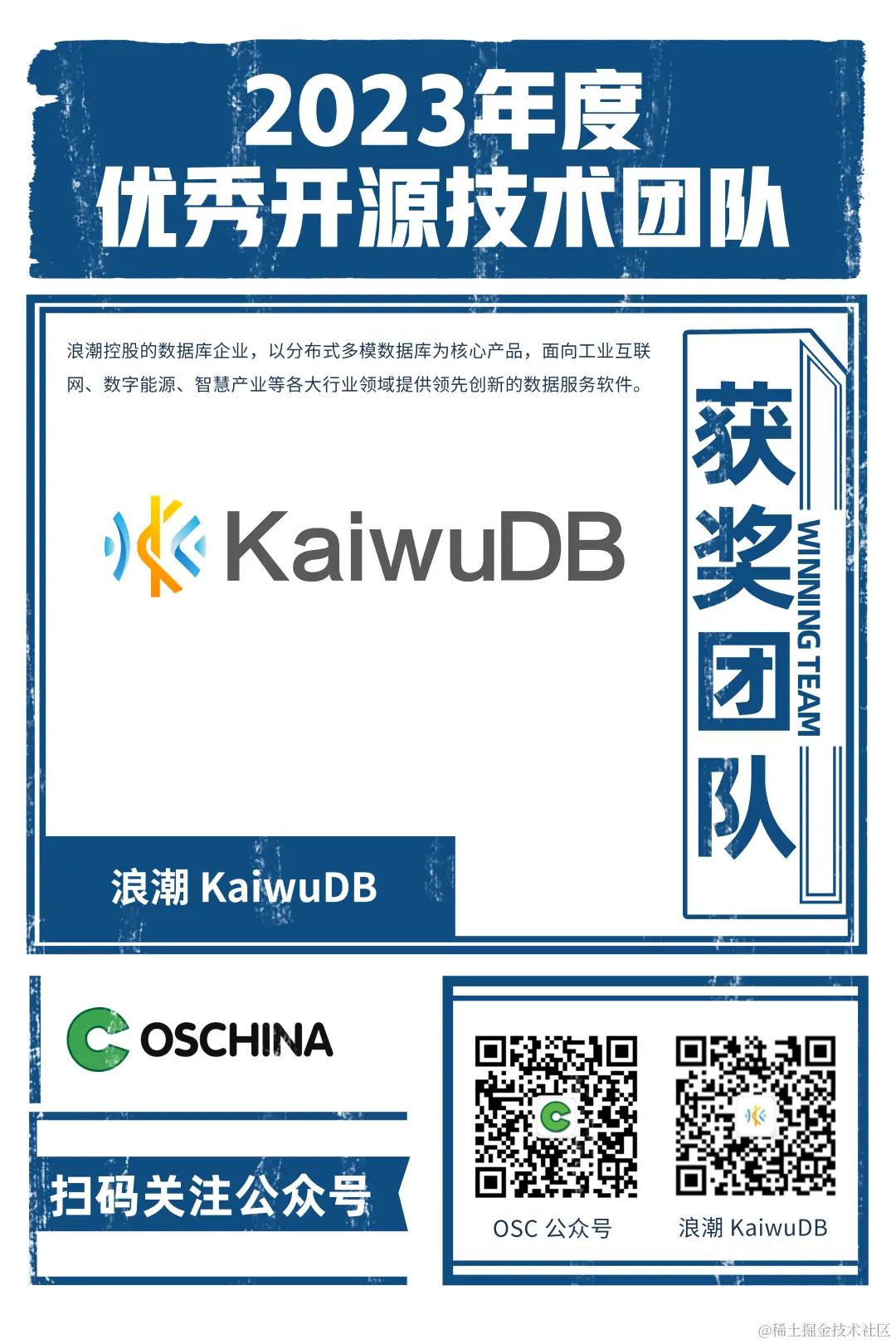 近日,国内知名开源技术社区开源中国(OSCHINA)面向其平台上各大认证官方技术团队、开源社区帐号,结合年度发表的内容深度及广度、开展各种活动运营影响力等多方表现层层筛选,最终 KaiwuDB 获颁 OSCHINA “2023年度优秀开源技术团队” 奖项。
