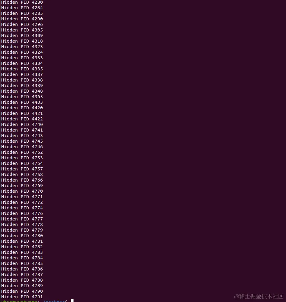 import osdef get_max_pid(): pid_list = [int(pid) for pid in os.listdir('/proc') ifpid.isdigit()] return str(max(pid_list))def get_existing_process_ids(max_pid): process_ids = [] for pid in range(1, int(max_pid) + 1): if os.path.exists('/proc/' + str(pid)): process_ids.append(str(pid)) return process_idsdef get_ps_aux_process_ids(): process_ids = [] output = os.popen('ps aux').read() lines = output.split('n') for line in lines[1:]: if line.strip() != '': pid = line.split()[1] process_ids.append(pid) return process_idsmax_pid = get_max_pid()existing_process_ids = get_existing_process_ids(max_pid)ps_aux_process_ids = get_ps_aux_process_ids()for pid in existing_process_ids: if pid not in ps_aux_process_ids: print('Hidden PID {}'.format(pid))