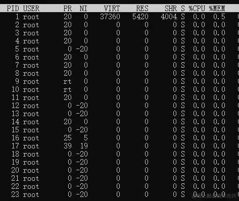 使用top命令查看进程占用列表。发现并没有占用过高的程序,但是查询cpu占用率确实是99%。怀疑是隐藏了linux进程。