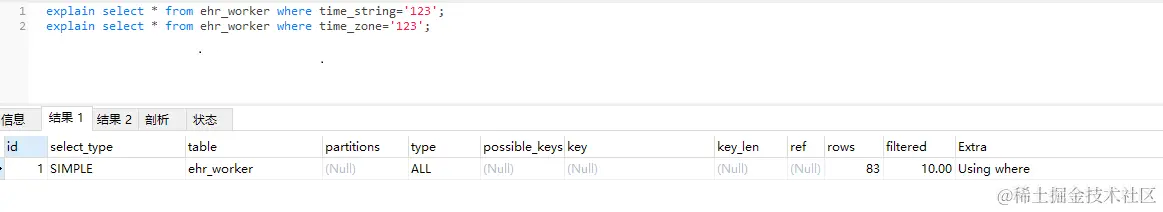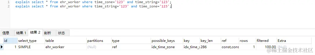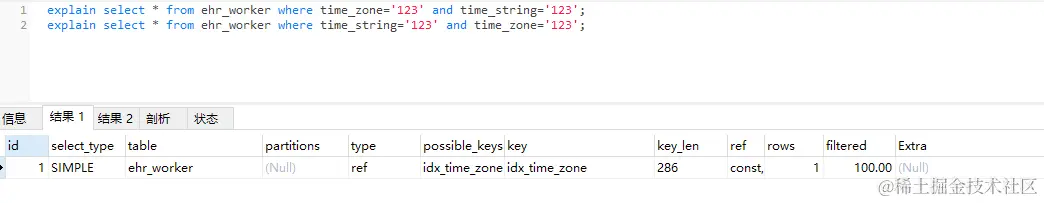 再看两条sql,建立的索引是 KEYidx_time_zone(time_zone,time_string) USING BTREE