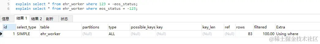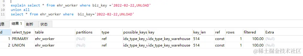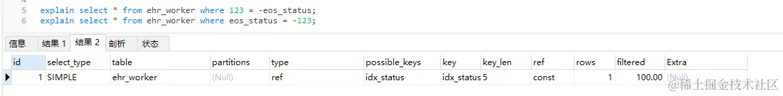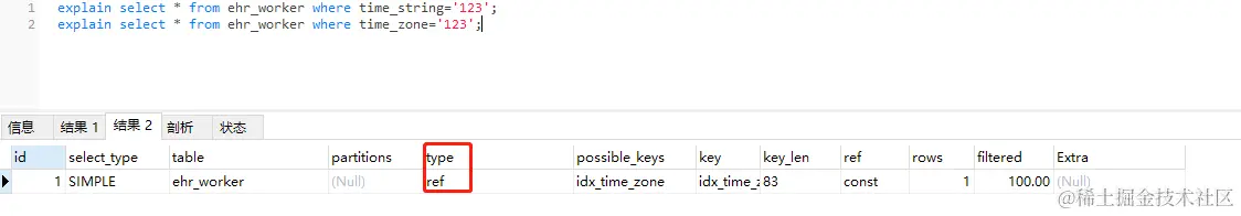 执行第二条sql,可以看到使用了索引。