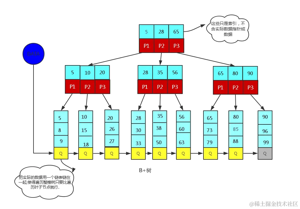 正是因为B+树的叶子节点是通过链表连接的,所以找到下限后能很快进行区间查询,比正常的中序遍历快