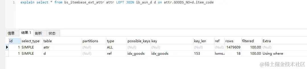 准备两张表,一张表 ib_asn_d 数据 9175, 一张表 bs_itembase_ext_attr 数据 1584115,都在商品编码字段上有索引。