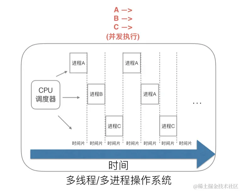 后来操作系统就具有了最早的并发能力:多进程并发,当一个进程阻塞的时候,切换到另外等待执行的进程,这样就能尽量把 CPU 利用起来,CPU 就不浪费了。