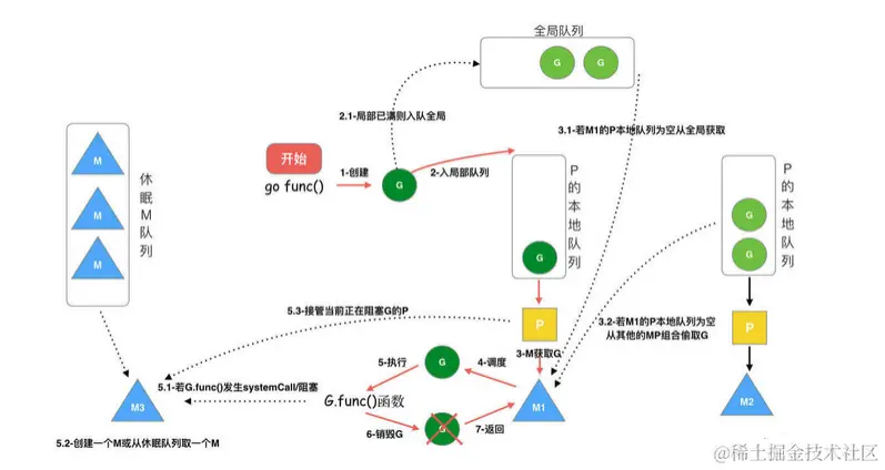 - 当 M 系统调用结束时候,这个 G 会尝试获取一个空闲的 P 执行,并放入到这个 P 的本地队列。如果获取不到 P,那么这个线程 M 变成休眠状态, 加入到空闲线程中,然后这个 G 会被放入全局队列中。