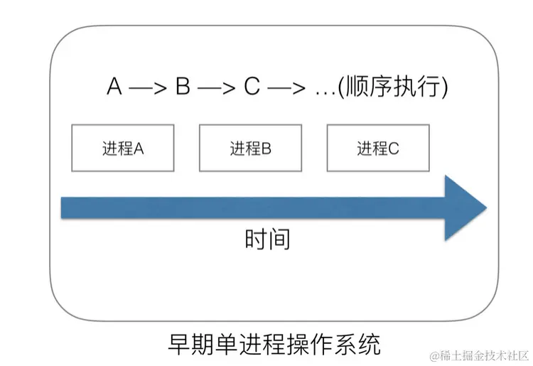 我们知道,一切的软件都是跑在操作系统上,真正用来干活 (计算) 的是 CPU。早期的操作系统每个程序就是一个进程,直到一个程序运行完,才能进行下一个进程,就是 “单进程时代”