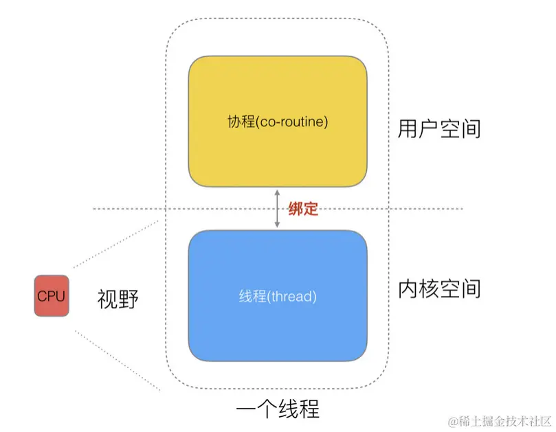 我们再去细化去分类一下,内核线程依然叫 “线程 (thread)”,用户线程叫 “协程 (co-routine)”.