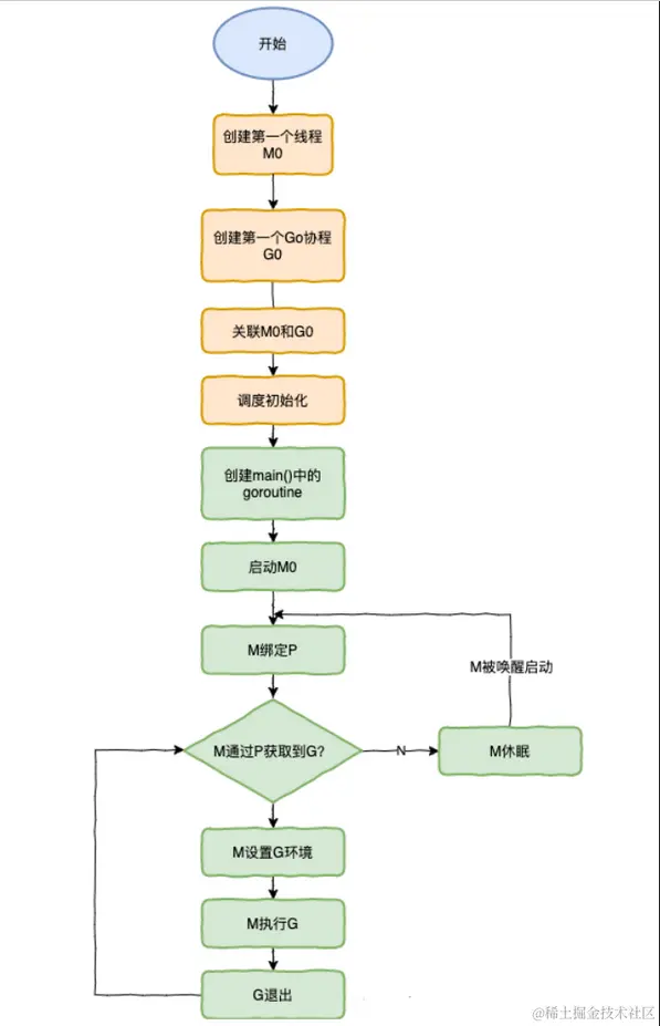 - M:线程想运行任务就得获取 P,从 P 的本地队列获取 G,P 队列为空时,M 也会尝试从全局队列拿一批 G 放到 P 的本地队列,或从其他 P 的本地队列偷一半放到自己 P 的本地队列。M 运行 G,G 执行之后,M 会从 P 获取下一个 G,不断重复下去。