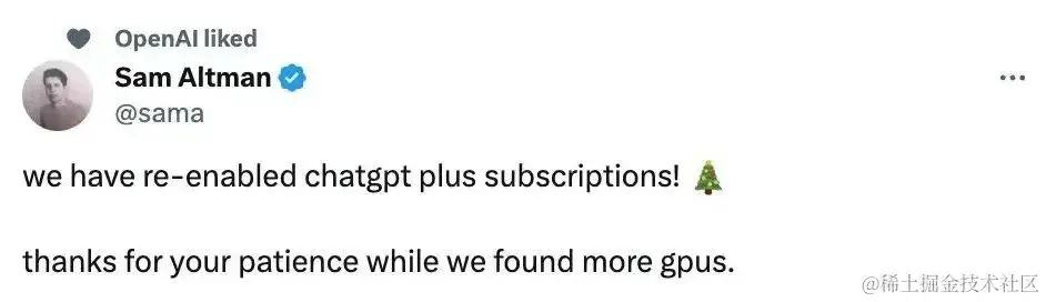 在 ChatGPT Plus 暂停新用户注册一个月之后,重返 OpenAI 的首席执行官萨姆·奥特曼(Sam Altman)在 𝕏 上表示:“我们已重新开放 ChatGPT Plus 新用户订阅,感谢大家的耐心等待,他们已找到更多 GPUs。”