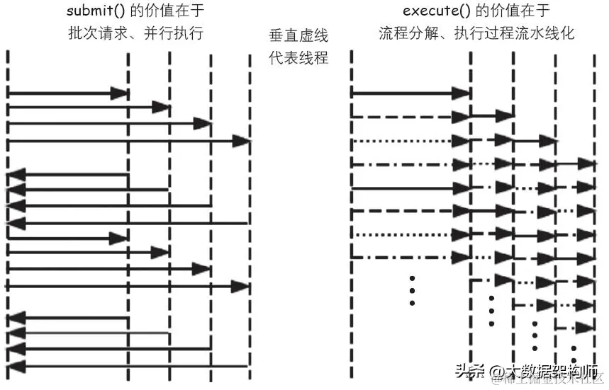图2-11演示了submit()和execute()的执行原理。submit()从单个线程中一次性提交多个任务,每个任务分别被一个线程执行,从而实现了任务的多核并行执行。execute()则将任务分成多个步骤后,依次提交给负责每个步骤的线程执行,将执行的过程流水线化。