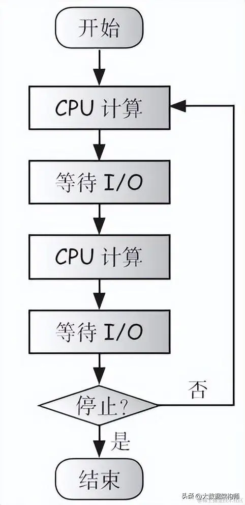 因此,在这类程序执行的过程中,会频繁地在CPU计算和等待I/O完成这两种状态之间切换,图2-7正描述了这种情况的程序流程图。