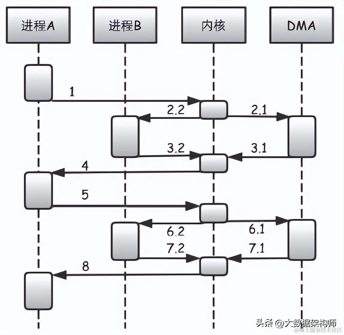 步骤2.1:处于内核态的进程A触发DMA后继续执行,DMA开始从磁盘读数据到内存。