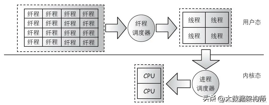 有!这就是纤程(fiber),也叫作协程(coroutine)。图2-9是纤程的工作原理,纤程是一种用户态的线程,其调度逻辑在用户态实现,从而避免了过多地进出内核态进行进程调度和上下文切换。事实上,纤程才是最理想的线程!那纤程是怎样实现的呢?