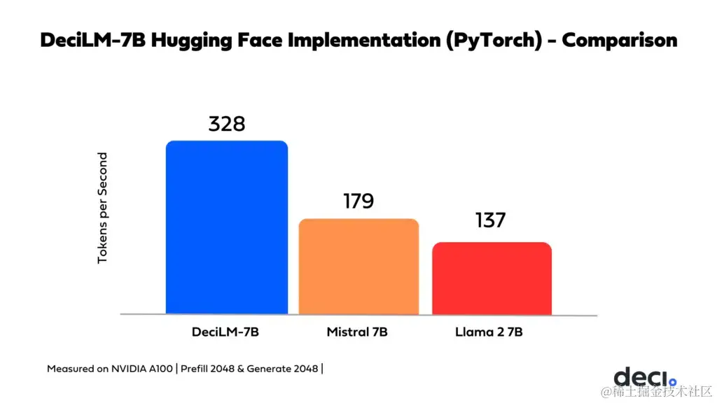 - 吞吐量性能: 在PyTorch基准测试中,DeciLM-7B展现了显著的性能优势,其吞吐量比Mistral 7B高出1.83倍,超过Llama 2 7B的2.39倍。