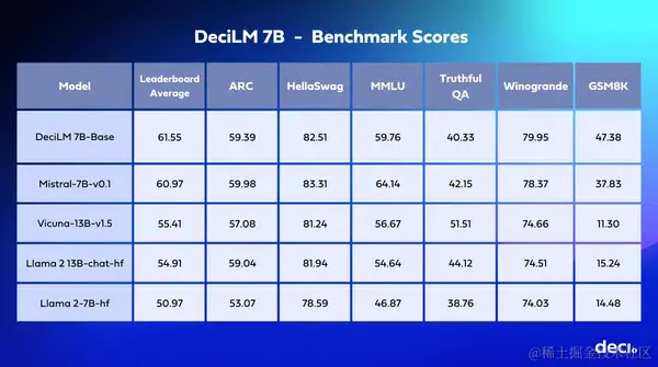 - 准确度: DeciLM-7B在Open LLM Leaderboard上的平均得分高达61.55分,超过了同等级别的竞争者,如Mistral 7B。这种准确性的提升使得DeciLM-7B在从客户服务机器人到复杂数据分析等各种应用中更加可靠和精确。