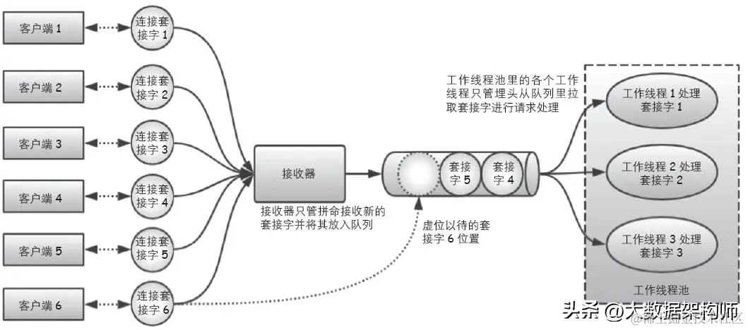 既不能运行太多线程,也不愿意水平扩展机器数量,那怎样才能提升程序的性能呢?我们不妨这样思考,接收器无阻塞地接收连接套接字,并将新接收的连接套接字暂存到一个缓冲区。当工作线程在处理完一个连接套接字后,从缓冲区取出暂存的连接套接字进行处理。如此一来,接收器可以不停地接收新的连接套接字,而工作线程的任务也被安排得满满当当。