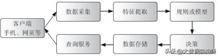互联网金融风控的一般流程如下所述。用户在手机或网页等客户端发出注册、贷款申请等事件时,客户端将用户属性、行为、生物识别、终端设备信息、网络状况、TCP/IP协议栈等信息发送到数据采集服务器;数据采集服务器收到数据后,进行字段提取和转化,发送给特征提取模块;特征提取模块按照预先设定的特征清单进行特征提取,然后以提取出来的特征清单作为模型或规则系统的输入;最终依据模型或规则系统的评估结果做出决策。