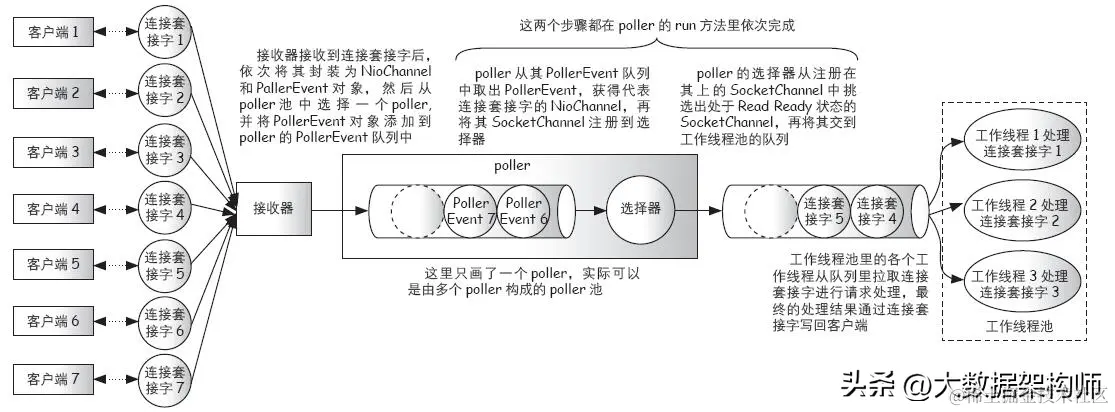 图2-5描述了NIO连接器的工作原理,当接收器接收新的连接套接字时,先将其依次封装成NioChannel对象和PollerEvent对象,再将PollerEvent对象放入PollerEvent队列。与此同时,轮询器不断从其PollerEvent队列中取出新的PollerEvent对象,获得代表连接套接字的NioChannel,再将其SocketChannel注册到选择器。选择器从注册在其上的SocketChannel中挑选出处于Rea.Ready状态的SocketChannel,再将其交到工作线程池的队列。工作线程池中的各个工作线程从队列中取出连接套接字,并读取请求数据进行处理,在处理完成时再将结果通过连接套接字发送回客户端。