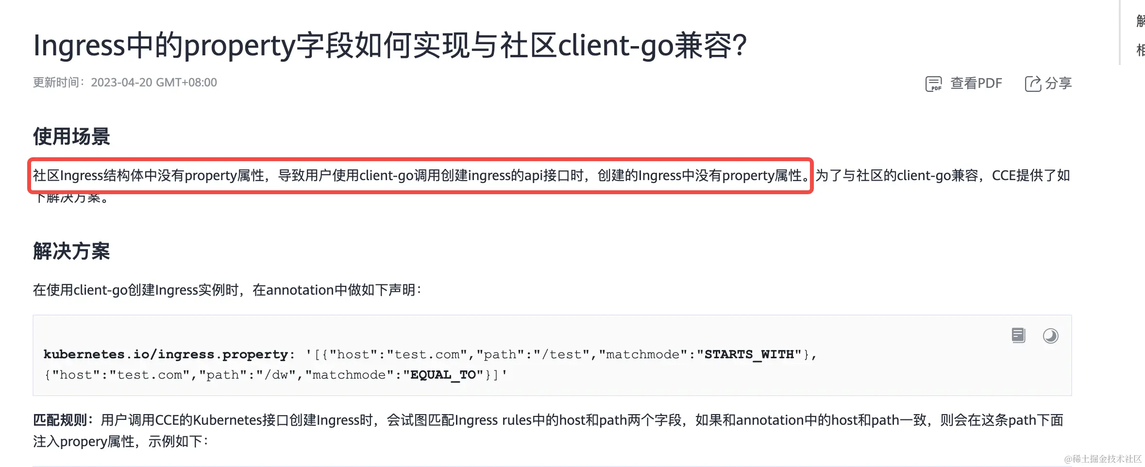 cce的ingress支持前缀匹配,精确匹配和正则匹配三种路径匹配规则。按照官方文档的描述(support.huaweicloud.com/cce_faq/cce… ),cce是通过ingress中的property字段来标明路径匹配规则,而这个property字段在社区的ingress上是没有的。