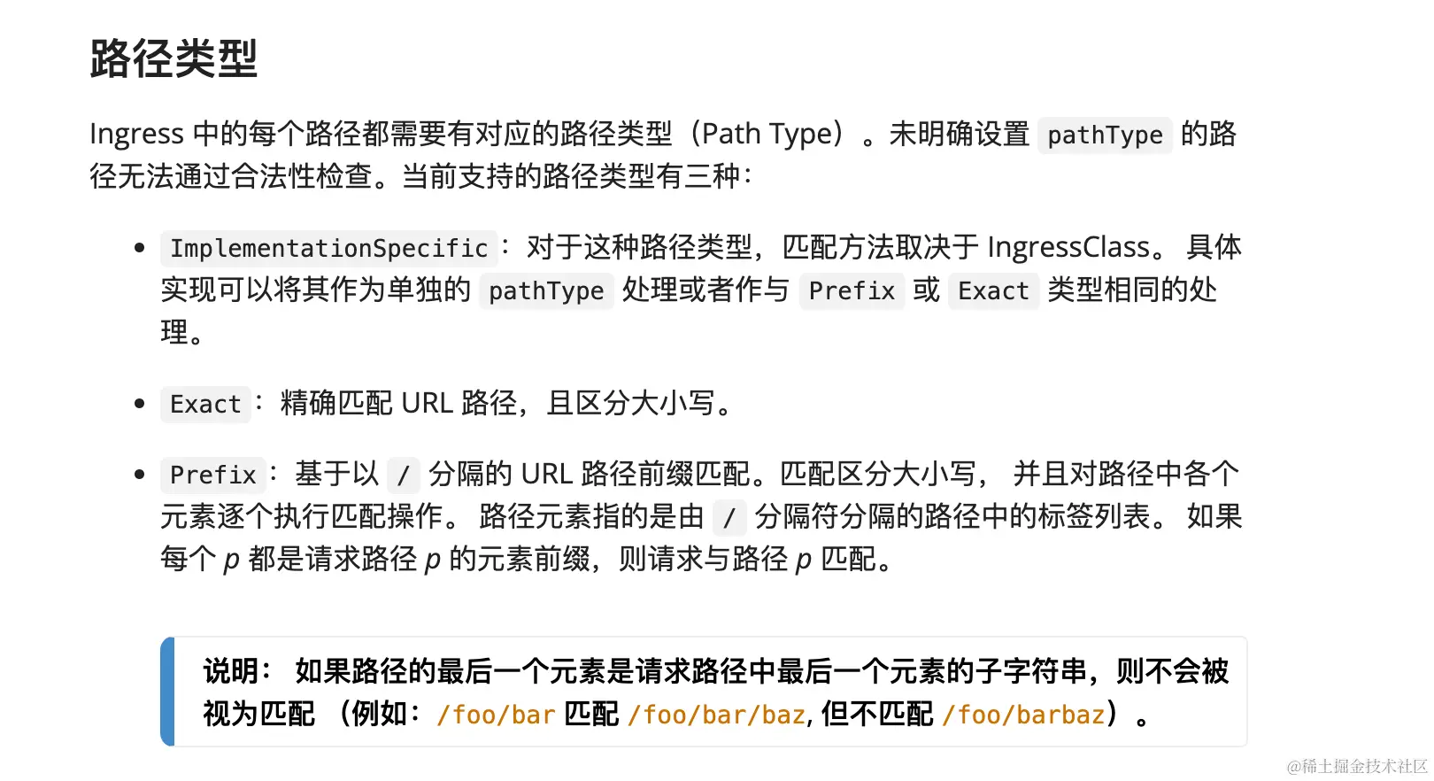 目前官方k8s支持的路径匹配规则只有以下三种类型,但不同的云厂商通过自己实现对应的ingress controller,往往还支持正则匹配等不同的路径规则。
