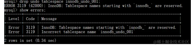 MySQL 服务启动后,默认有两个 Undo 表空间:undo01,undo02。这两个默认产生的 Undo 表空间文件,不能在 SQL 层面来管理。直接删除会被 MySQL 阻止。