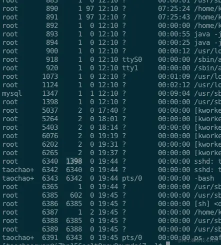 如果去一台linux机器上ps -eaf一下,你会看到每个进程都会对应一个父进程,下图中第二列为当前进程的pid,第三列为父进程的pid。并且所有的进程都会有一个祖先进程,即pid为1的进程。