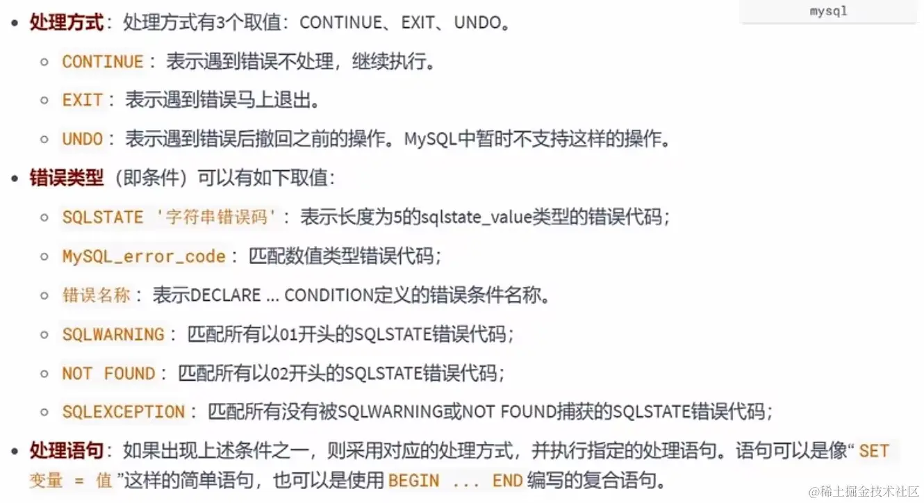 DECLARE 处理方式 HANDLER FOR 错误类型 处理语句;