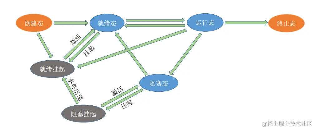 就绪态:已经具备运行条件,但由于没有空闲CPU,而暂时不能运行