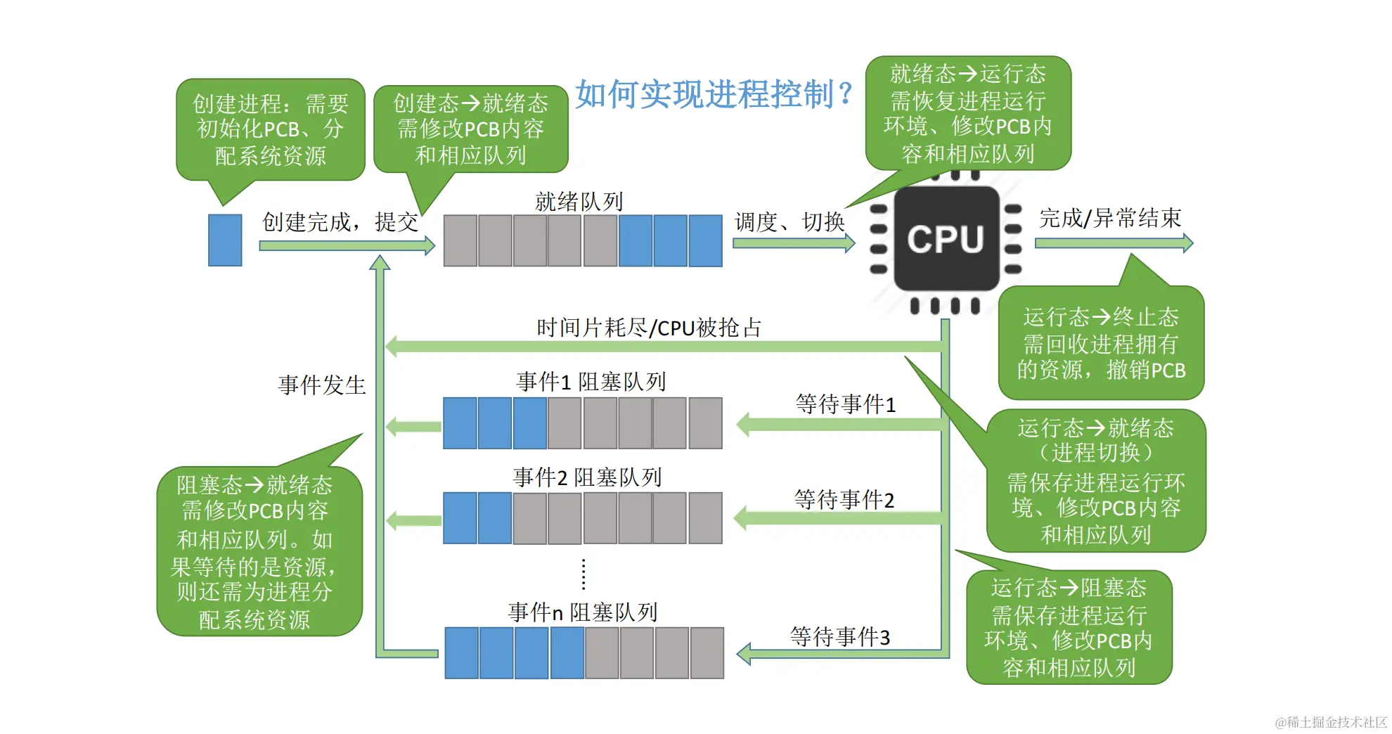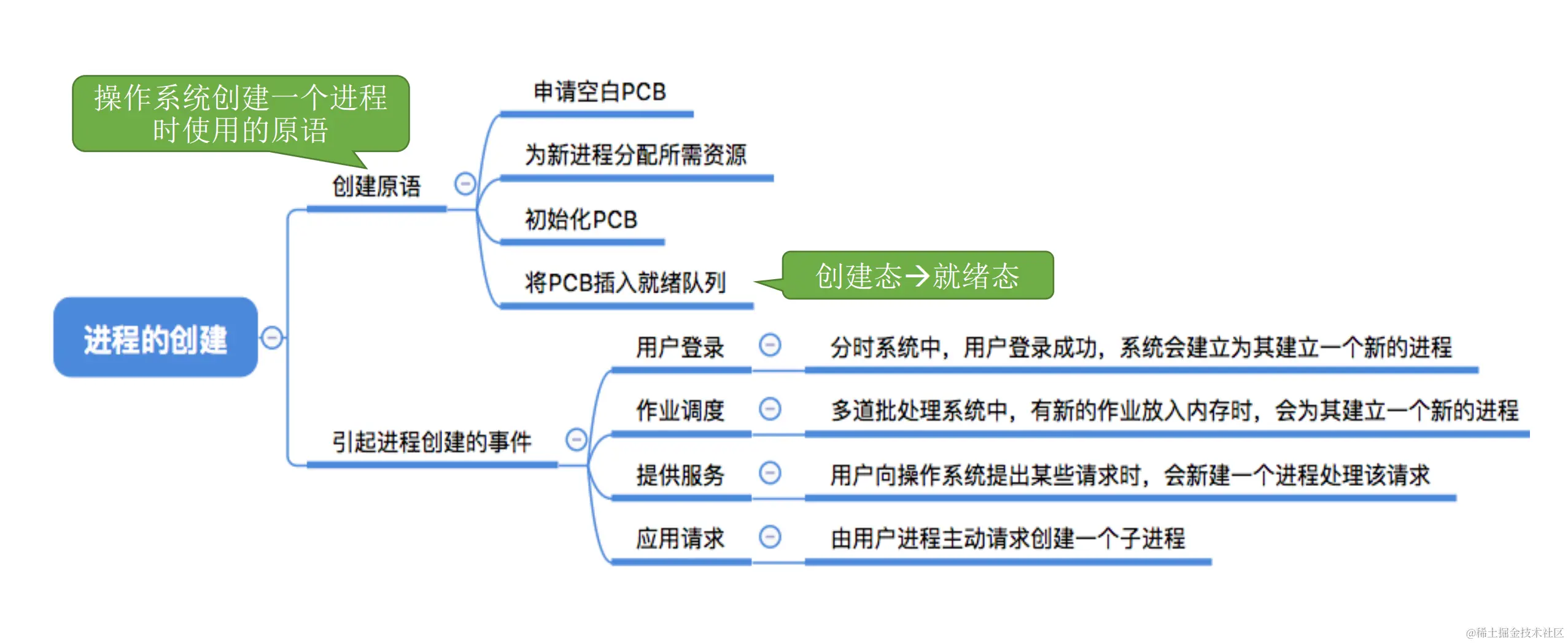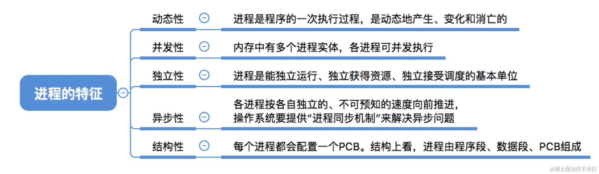 PCB是进程存在的唯一标志,当进程被创建时,操作系统为其创建PCB,当进程结束时,会回收其PCB。