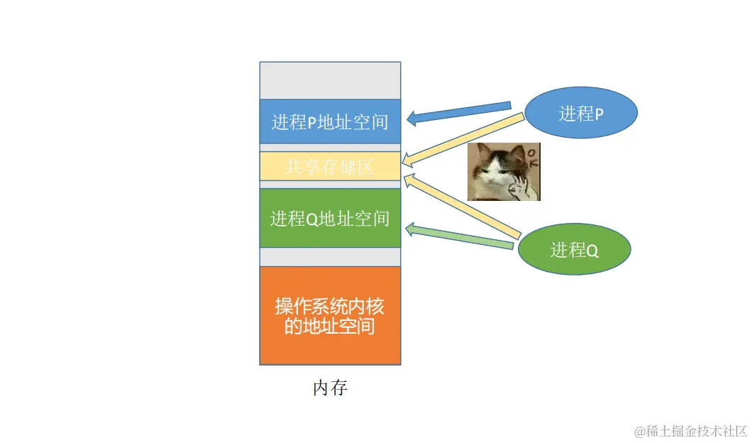 **基于存储区的共享:**操作系统在内存中划出一块共享存储区,数据的形式、存放位置都由通信进程控制,而不是操作系统。这种共享方式速度很快,是一种高级通信方式。