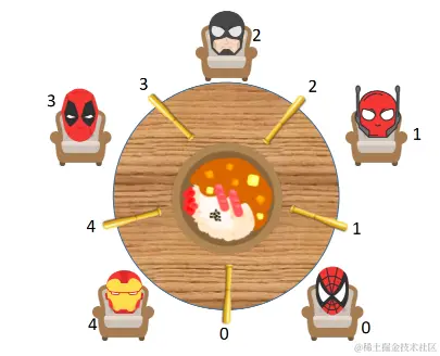 - 仅当一个哲学家左右两支筷子都可用时才允许他抓起筷子。