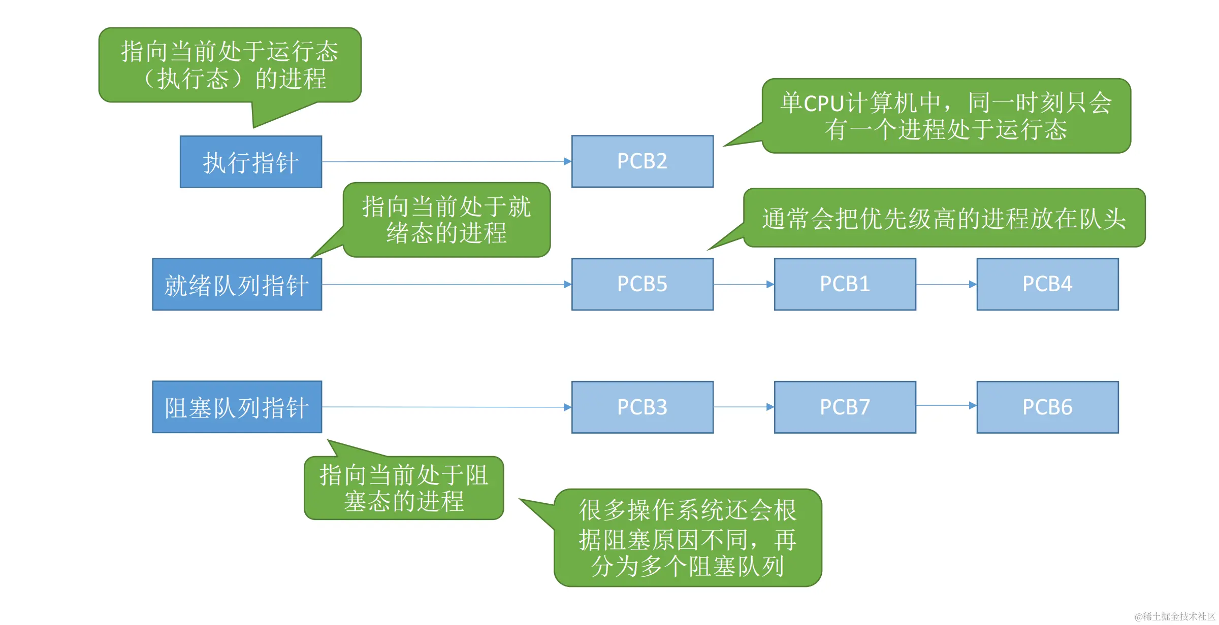 **阻塞队列指针:**指向当前处于阻塞态的进程(很多操作系统还会根据阻塞原因不同,再分为多个阻塞队列)