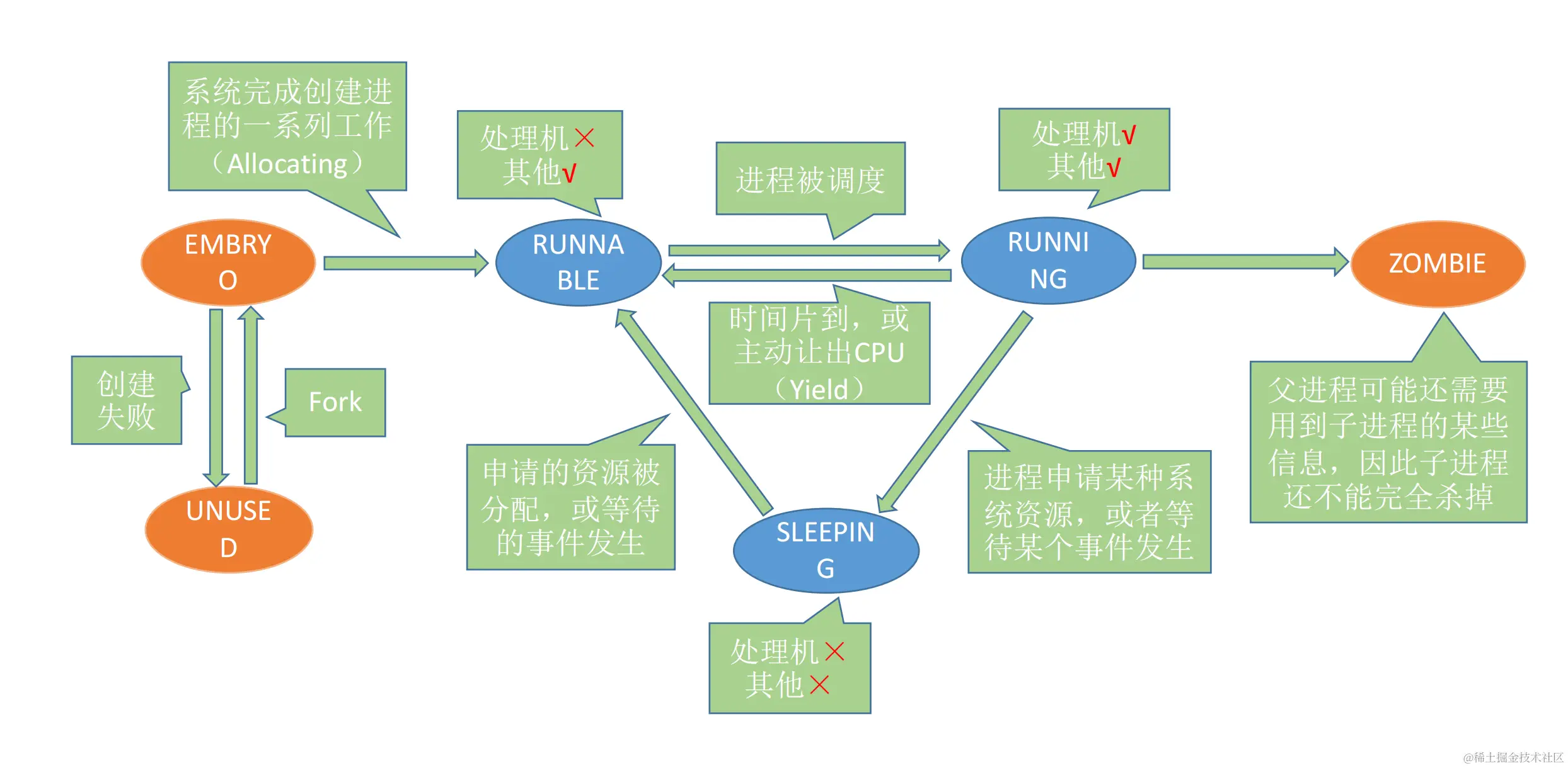 运行态:占有CPU,并在CPU上运行