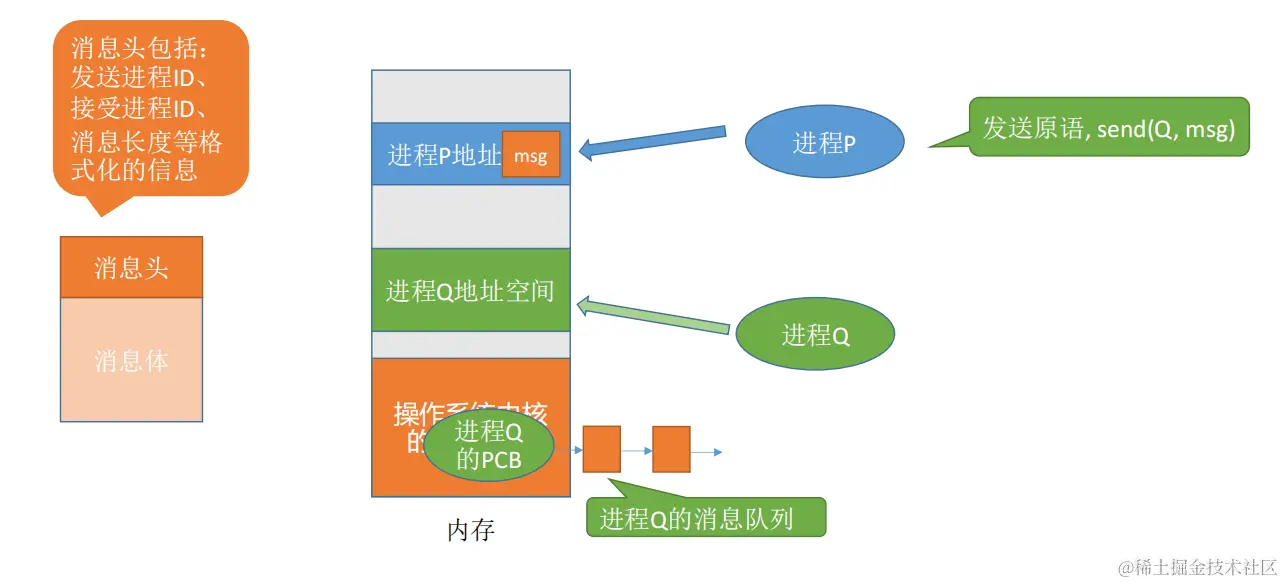 进程间的数据交换以格式化的消(Message)为单位。进程通过操作系统提供的“发送消息/接收消息”两个原语进行数据交换。