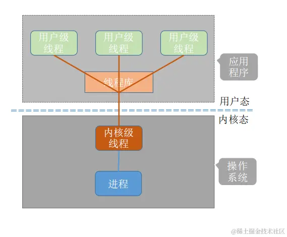 - 用户级线程由应用程序通过线程库实现,所有的线程管理工作都由应用程序负责(包括线程切换)