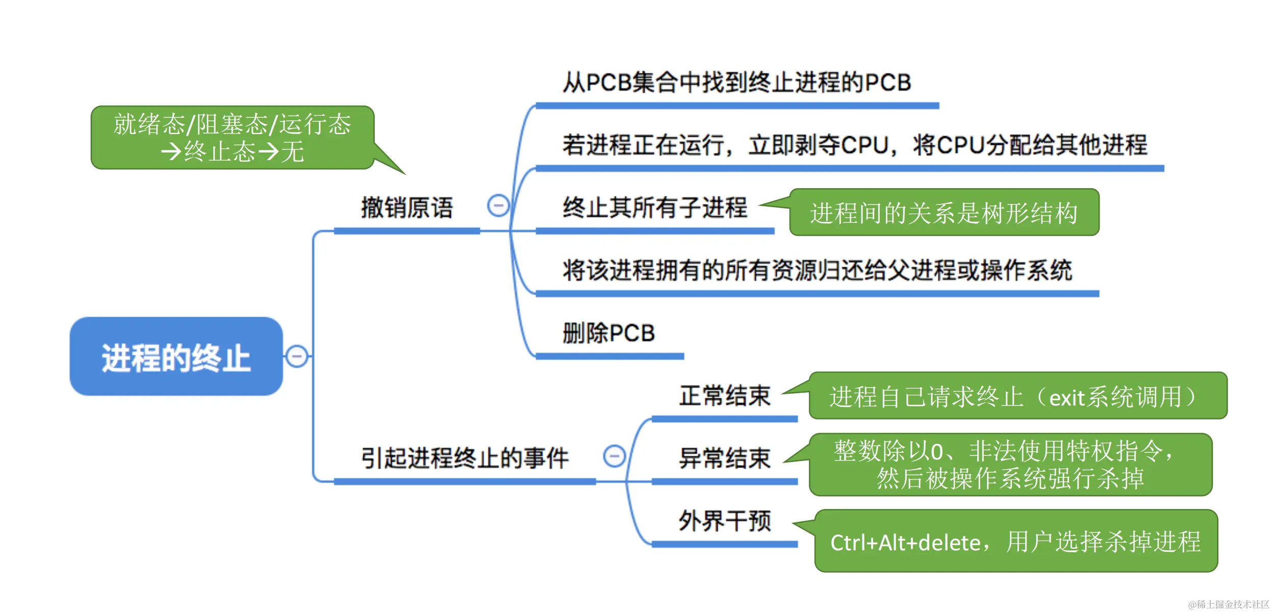 终止态(结束态):进程正在从系统中撤销,操作系统回收进程的资源、撤销PCB